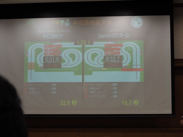 さて、タイムは32.7秒ですが、これに途中の障害物をクリアーしたボーナスタイムが加算されます。結果は、18.7秒と右コースでも相手チームより良いタイムを残すことができたようです。デベロッパー部門は、競技だけでなく今回のロボットのプログラミングをどのようなコンセプトで製作したかのモデル審査も含みます。競技ではできるだけのことは行いましたので、あとはモデル審査と総合成績の発表を予選突破を祈りながら待ちます。