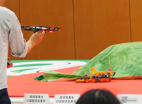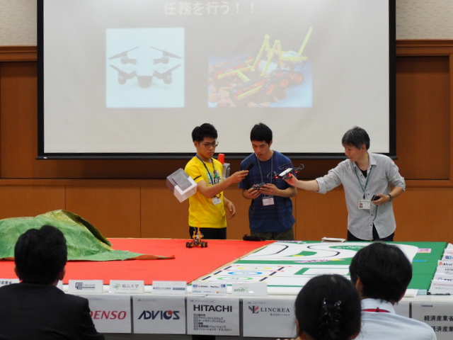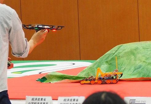 途中、地上ロボットの無線操縦が上手くいかなくなって四苦八苦!かなり冷や汗をかきましたが、何とか土砂災害のジオラマを一周し、帰還することができました。また、行平さんはロボットを操縦しながら発表者として開発テーマや機器の詳細なども紹介し、かなり大変だったようですが、どうにか無事にプレゼンテーションが終わりました。会場の審査員の方からも「災害救助のコンセプトは良い。機器開発はまだまだなのでこれから頑張って。」等の温かいアドバイスをいただきました。