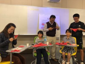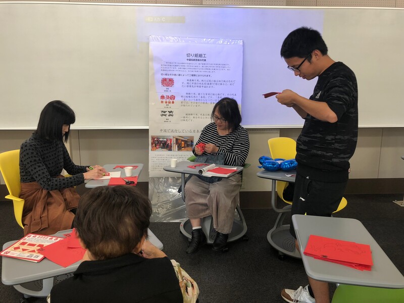中国の切り紙コーナーも中国文化に関心のある方や子連れの方で賑わっていました。今年の9月に入学したばかりの経済学部国際経済学科2年生の管 宇鵬くんは、ハサミを操り見事に動物や花などの絵柄を切り抜き、手本を見せてくれました。「紙切り」は少し技がいるようですが、中国で歴史の教諭免許も持っている管くんは手取り足取りで親切に教えてくれました。そのうち、他の中国人留学生も輪に入り、中国とゆかりがある方々とも話に花を咲かせました。