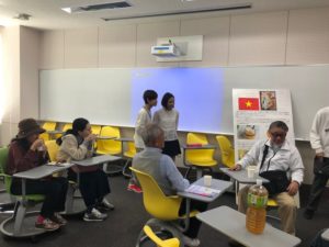 午前のベトナムタイムでは、留学生はベトナムの黒豆ぜんざいを大鍋いっぱい作ってきました。時間前からすでに数名の方が会場で待っていましたので、慌ただしい出だしでしたが、「ちょうどいい甘さで美味しい!」「ココナッツ風味で爽やか!」との好評を受け、余裕を取り戻して笑顔いっぱいの交流ができました。