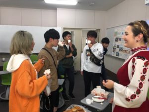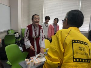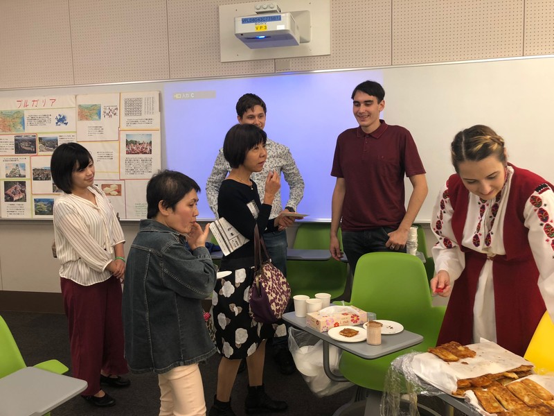 昼からはブルガリアタイムと中国の切り紙体験でした。ソフィア大学から来た交換留学生3人は、ブルガリアの国民食とも言われる「バニツァ」を作ってきました。「バニツァ」は、白いチーズや卵とヨーグルドを薄いパイ生地で包んで焼いたブルガリアの伝統的な食べ物です。作りたてのバニツァは、ジューシな香りとサクサクとした食感で皆さんに喜んでいただけたようです。バニツァを頬張りながら、日本人学生や市民の方々は留学生たちを囲んでブルガリアのことを熱心に聞いていました。