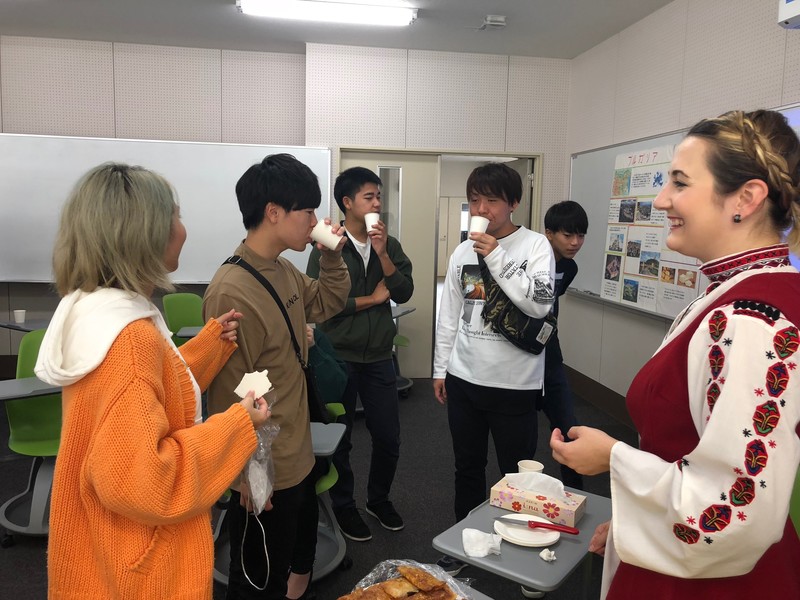 ブルガリアのソフィア大学交換留学生・人間文化学部所属のKadieva Tsuvetomila Nikolaevaさん、Kirov Radoslav Radoevくん、Mikhailin Vadimくんでした。(3人の感想:日本の大学祭は活気あふれて大好きです。また、バニツァは皆さんのお口に合ってよかったです。朝早くから作った甲斐がありました。)