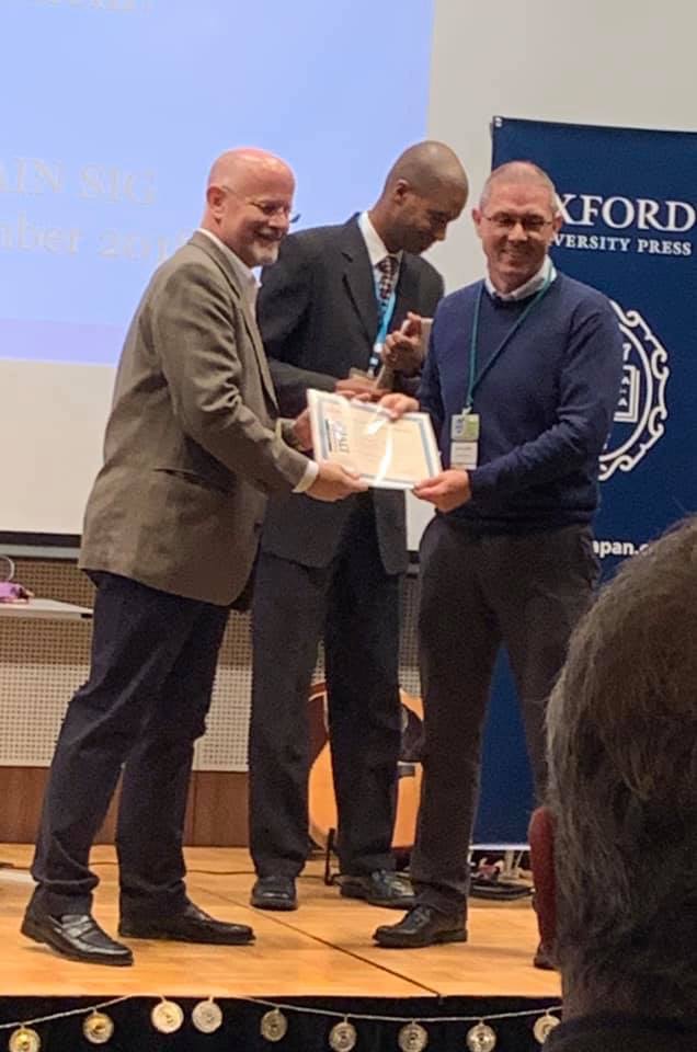 2018年度の優秀者に対する授賞式は、名古屋市で開催された2019年のJALT国際会議で、11月に行われました。各分野から選ばれた今年の受賞者は約25人であり、ローズ講師もその一人として表彰されたのです。