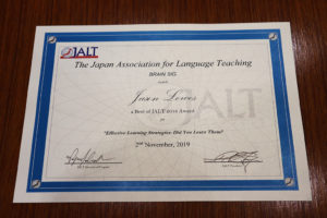 このたび、11月1日(金)~4日(月)に名古屋市にある愛知県産業労働センターで開催された第45回国際大会において、大学教育センターのジェイソン・ローズ(Jason Lowes)講師が、昨年度(2018)の教育実践研究に照らして最優秀JALT賞の表彰を受けました。
