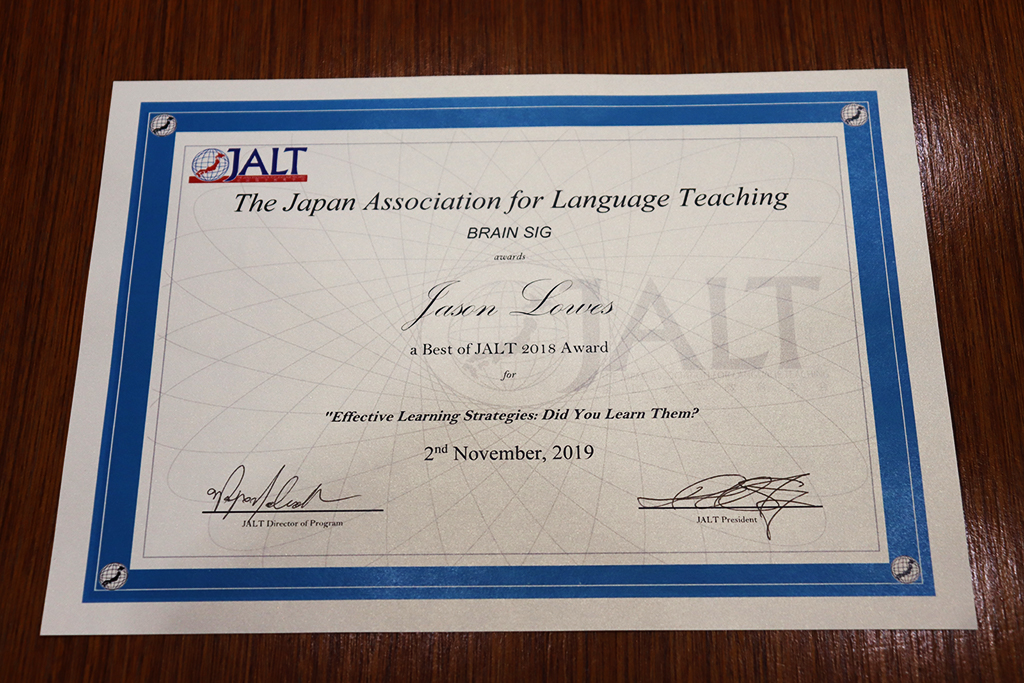 ローズ講師は、2018年にJALT国際会議において、自身の研究成果に基づいて有効な英語学習戦略とそれが英語教員のトレーニング用教材で活用しうる範囲についての研究発表を行いました。この研究発表は、この年に行われた最も優れた研究発表としてBrain SIG のメンバーによってノミネートされました。さらに、その後の投票の結果、最優秀に選ばれたのです。
