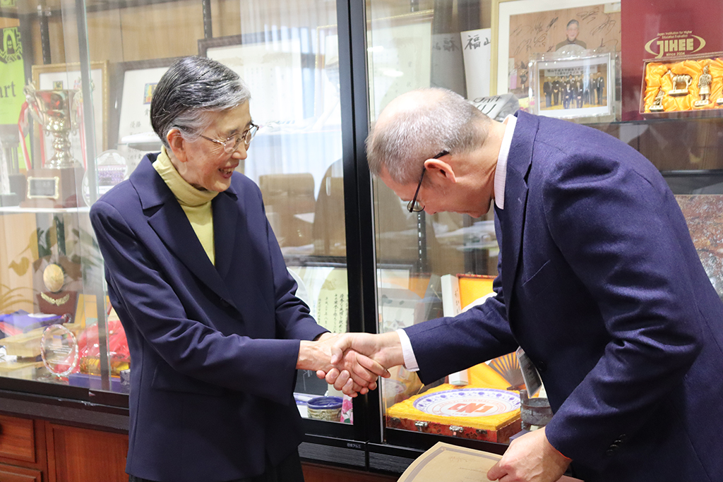 ちなみに、ローズ講師は、本学への赴任前に民間の英会話スクールで勤務していた約10年前にもJALTのこの賞を受賞したことがあり、久々に二度目の快挙となったことを付け加えます。早速、このことを松田学長に報告に上がり、学長もたいへん喜んでくださいました。