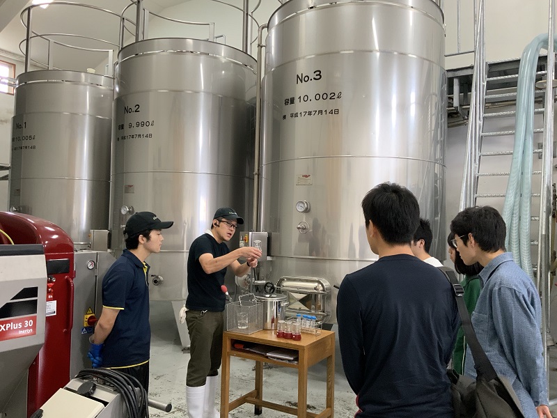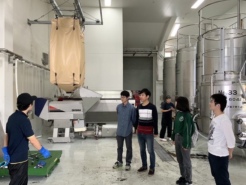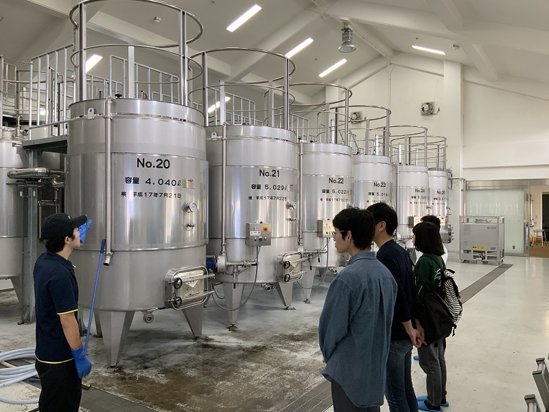 発酵を進めている間に、ワイナリーの所内見学をさせていただきました。せらワイナリーでは、当たり前ですが、衛生面に大変気をつけており、設備は全てとても清潔に保たれております。我々は、消毒した上で、特別に入らせていただいております。