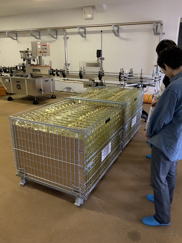 奥では、ワインの殺菌から瓶詰めまで行う施設を見学しました。また、販売直前となるワインのラベルを貼る直前のものを拝見しました。こちらは、ヌーヴォーであり、新酒のため、非常に美しい色合いのワインでした。下の写真は日光の当たる窓際にあり、天気の良い日であればもう少しきれいな色合いに見えるそうですが、当日は天気が悪かったため写真では少し伝わりにくいかもしれません。でも十分美しいですね。