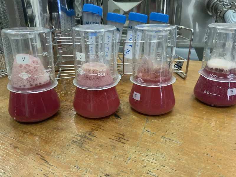 さて、予備発酵させているものを確認しに戻りました。発酵が進んでいるため、先ほどの写真とは大きく異なる様子が見て伺えます。順調に発酵している証拠ですね。これを更に容量を増やし、全て混合させて発酵を進めていきます。本日はここまででしたが、数時間後には5000ℓのブドウ果汁にて醸造しております。
