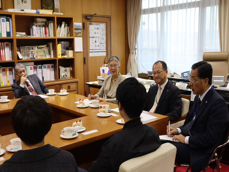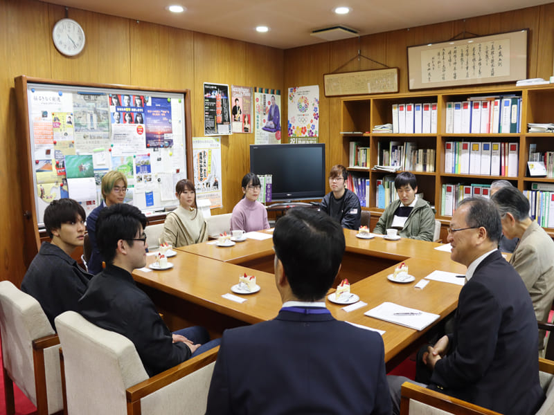 毎年、秋に行われる学生の学長室訪問が始まりました。学生の皆さんが日頃より感じている思いや大学への要望を松田学長に直接伝える機会として、学長室訪問は秋の恒例行事となっています。今年の第1回目は、11月6日(水)に11名の学生が学長室を訪問しました。山本学長補佐、平学長補佐、そして吉留事務局長の学長室のメンバーが、松田学長とともに学生の皆さんの話に耳を傾けました。その時の話題を紹介しましょう。(報告は山本学長補佐。投稿は企画・文書課の小林)