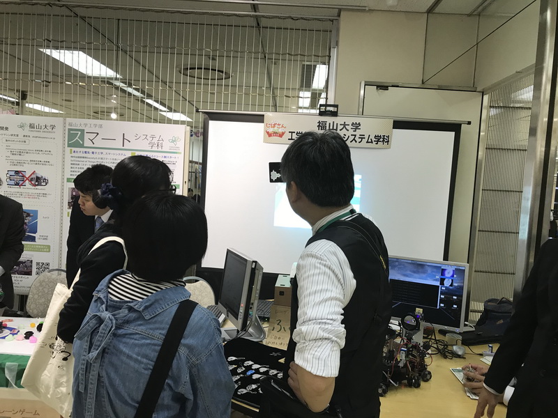 福山大学のコーナーに入ってすぐ右では、スマートシステム学科による学科紹介及び研究内容の紹介も行いました。