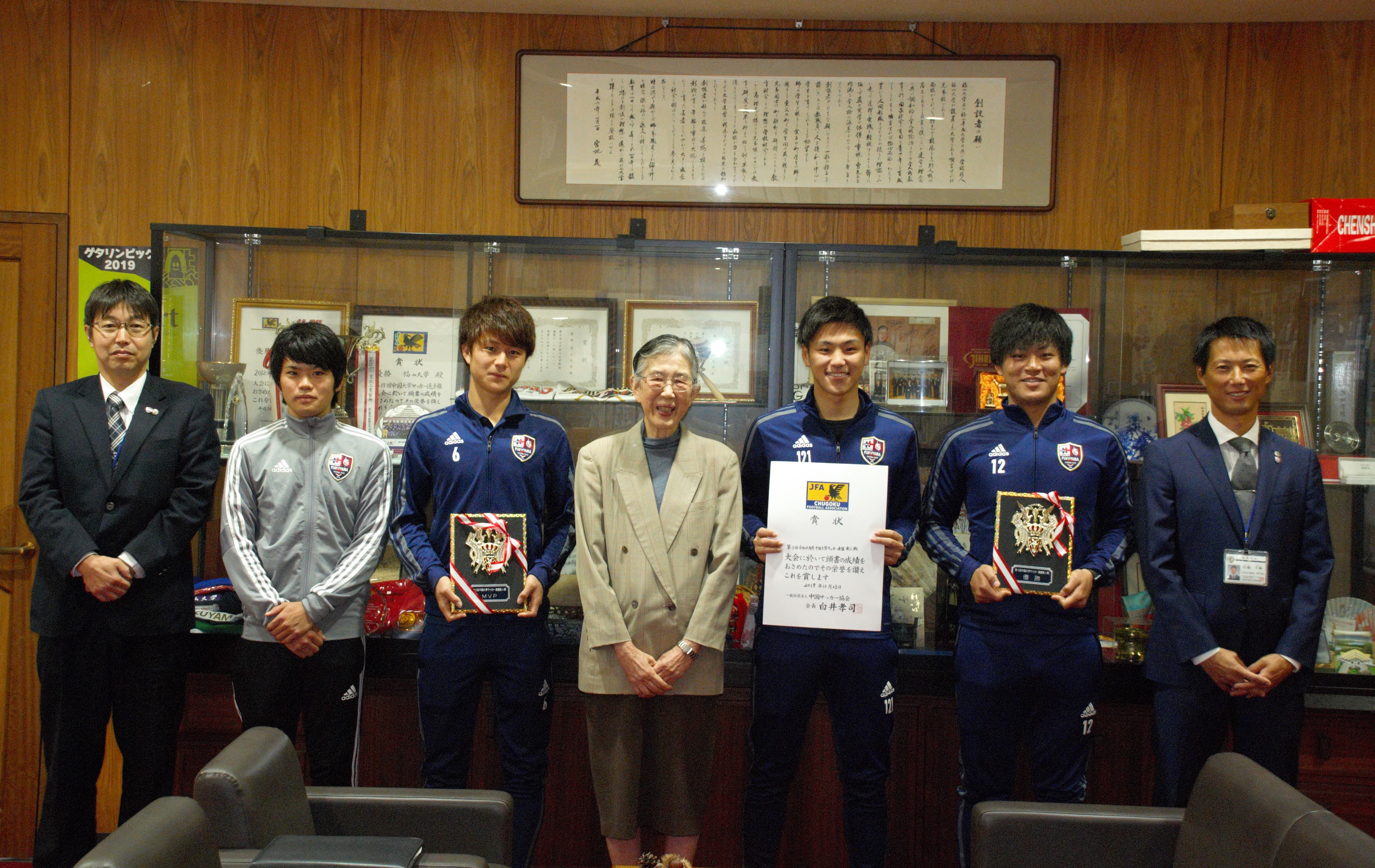学長から一言:新監督の下、サッカー部員がしっかりまとまって、上級生だけでなく、1、2年生も最後に力を発揮しましたねッ!おめでとう!!!そして原田 啓史君、MVPおめでとう!鹿児島から福山まで来てくれて、ありがとう!