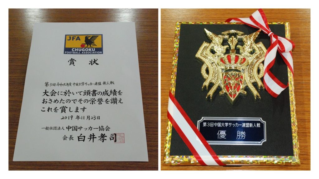 第3回(2019年度)中国大学サッカー連盟新人戦の賞状と盾