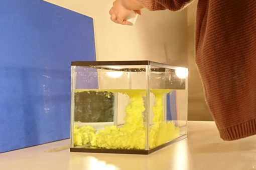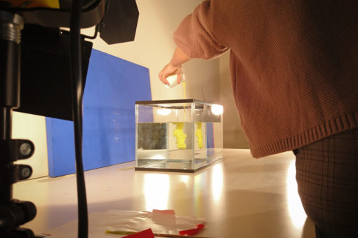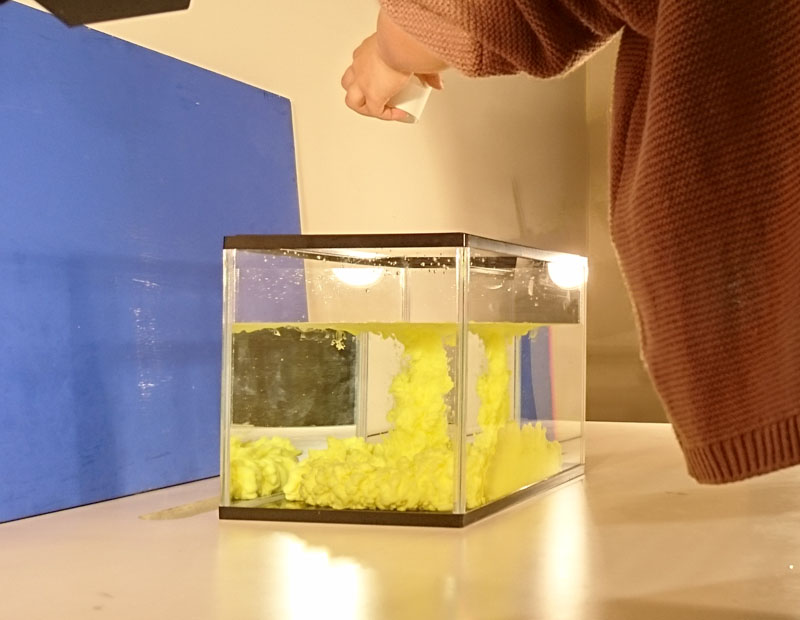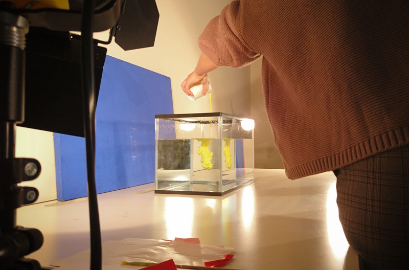 お分かりの方もおられるでしょうか。これは、実は〇〇を表現するための素材作りなのでした。水槽の後ろに青いボードが見えますが、これはブルーバック(気象予報士さんの後ろにあるのもこれです)で、この後、別の映像と合成するときに役立ちます。水を使っての〇〇のための素材作りはクラシックな特撮技法の一つでもあるのです。