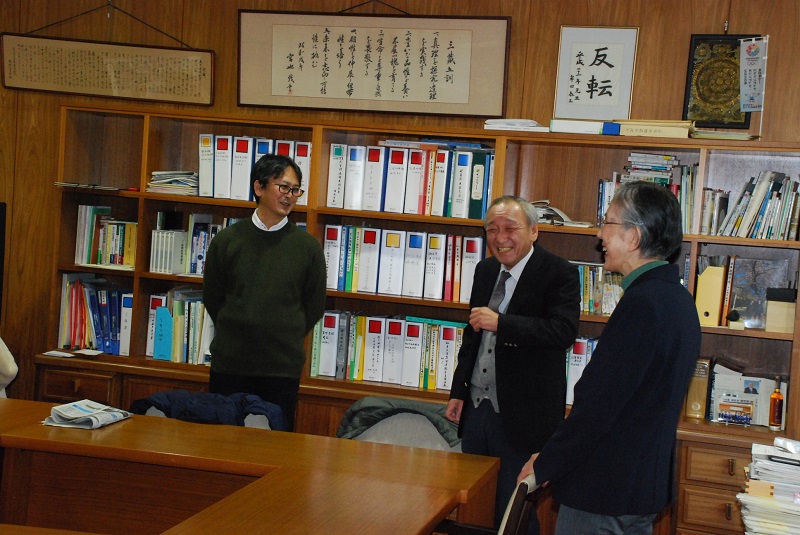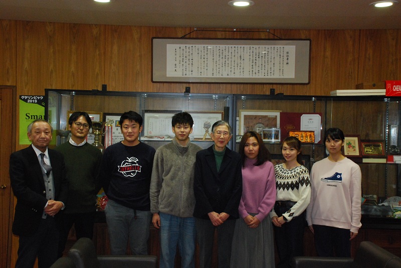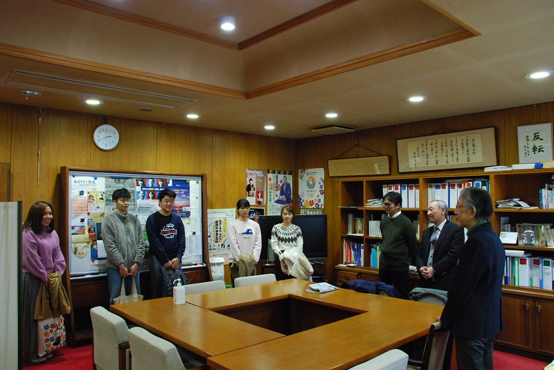 生物工学科の学生と教員合わせて16名でラオスを訪問し、LAODIでのラム酒づくりやラオス国立大学との交流(相互の教育・研究の紹介と学生の交流)、地元の小学生との交流、JICAの活動の学びなど様々な体験をする予定です。写真は、学長に抱負を語る学生たちです(14名を代表して5名)。