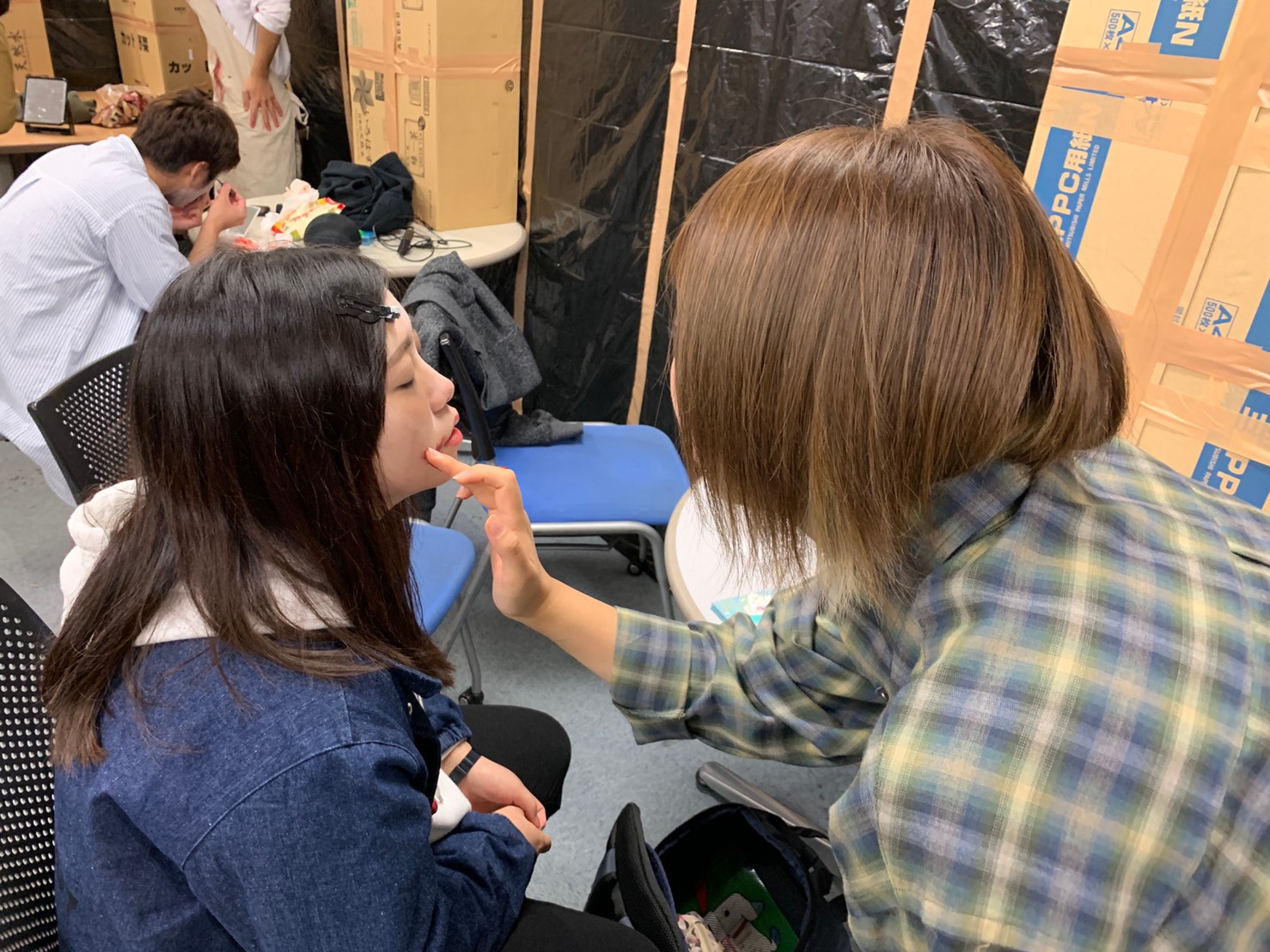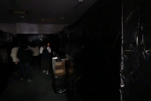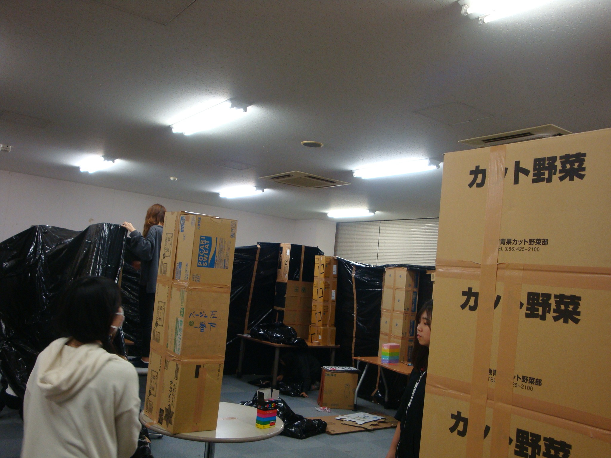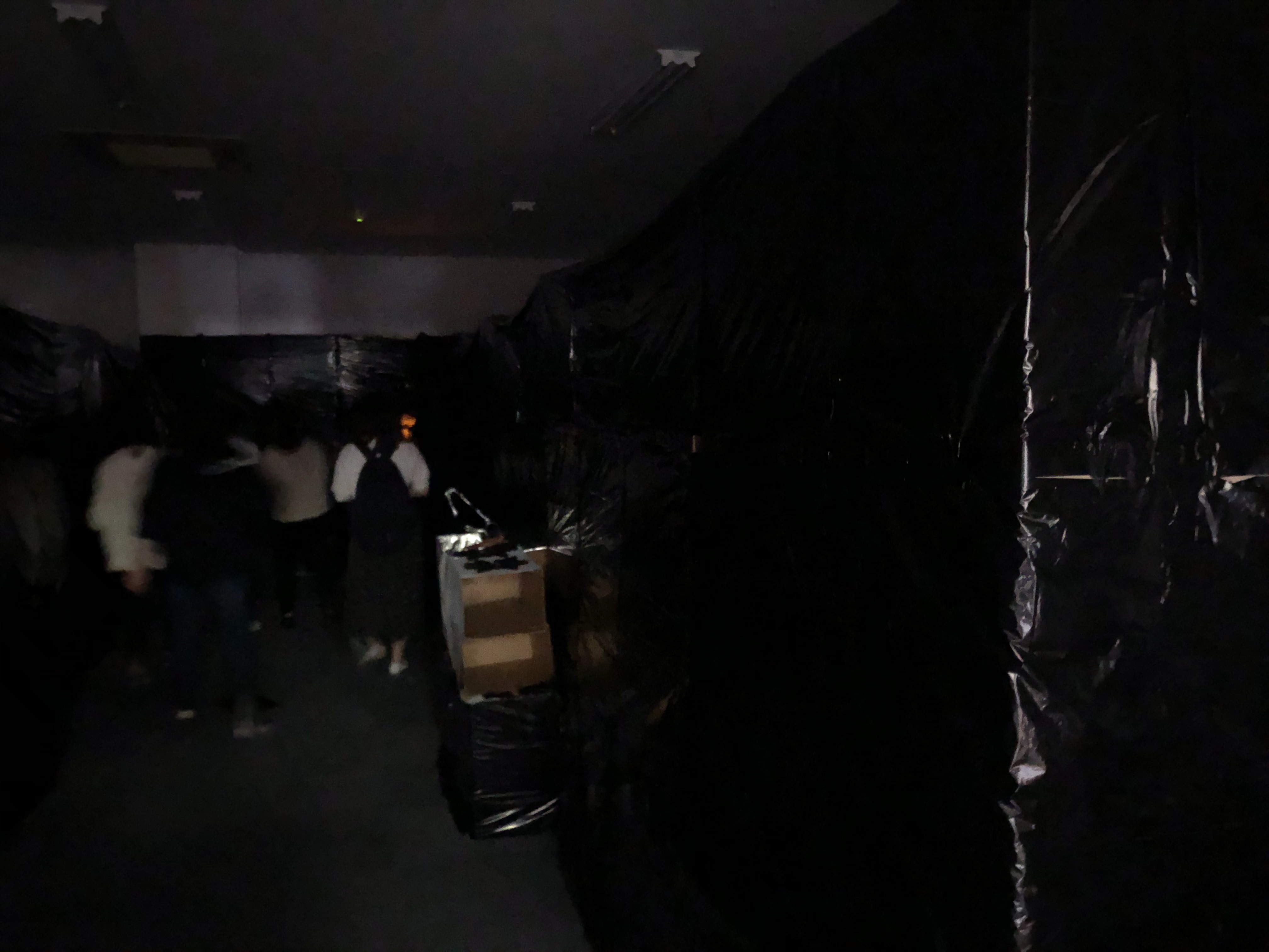 お化け屋敷の裏側はこんなふうになってます。段ボールとゴミ袋を駆使して壁を作り、中でメイクや音響の作業ができるようにしています。