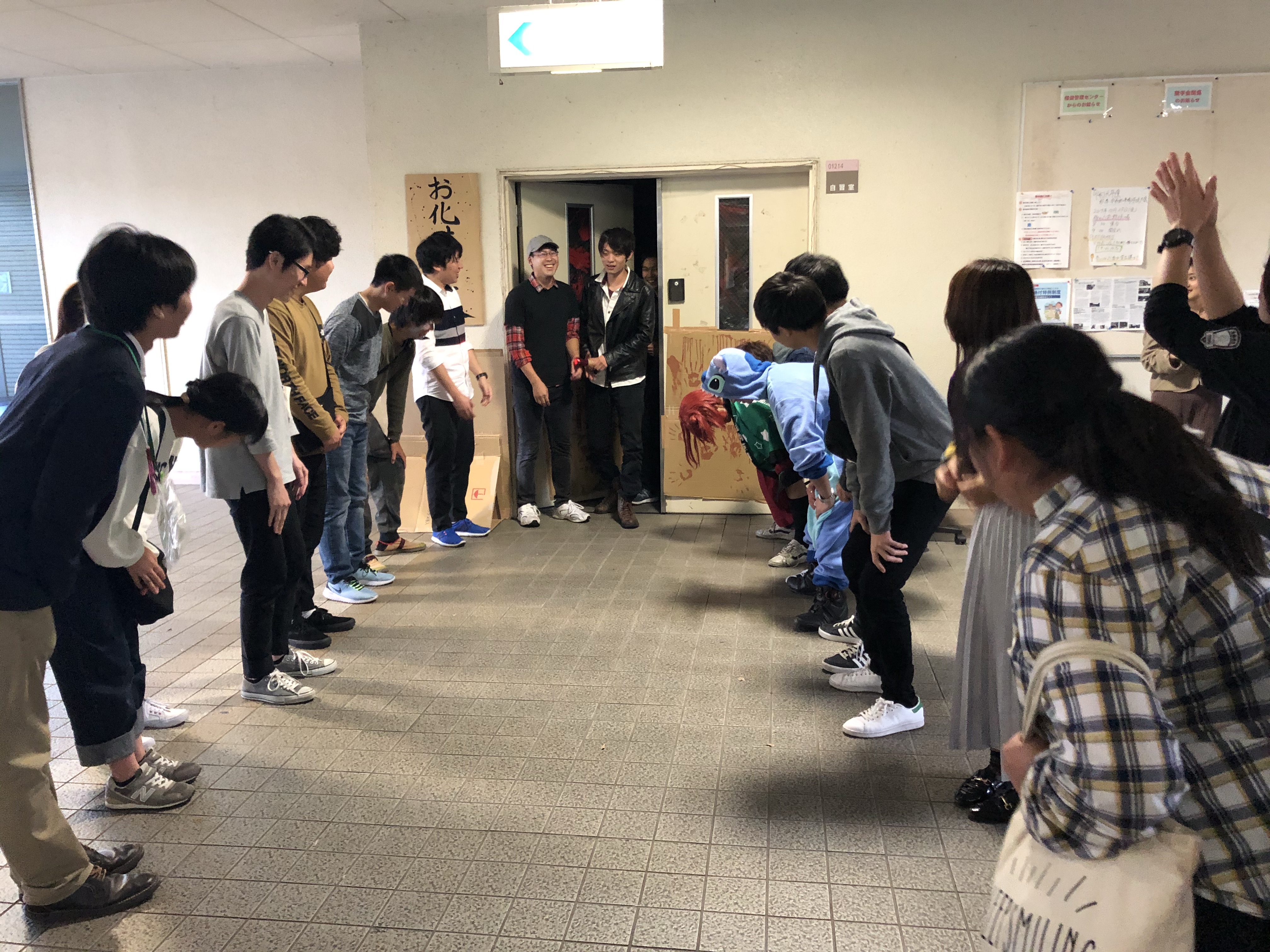 またまた、お化け屋敷に戻ります。いよいよ最後のお客さんをスタッフ一同、出口でお出迎え。お客さんは無事に帰ってきました!