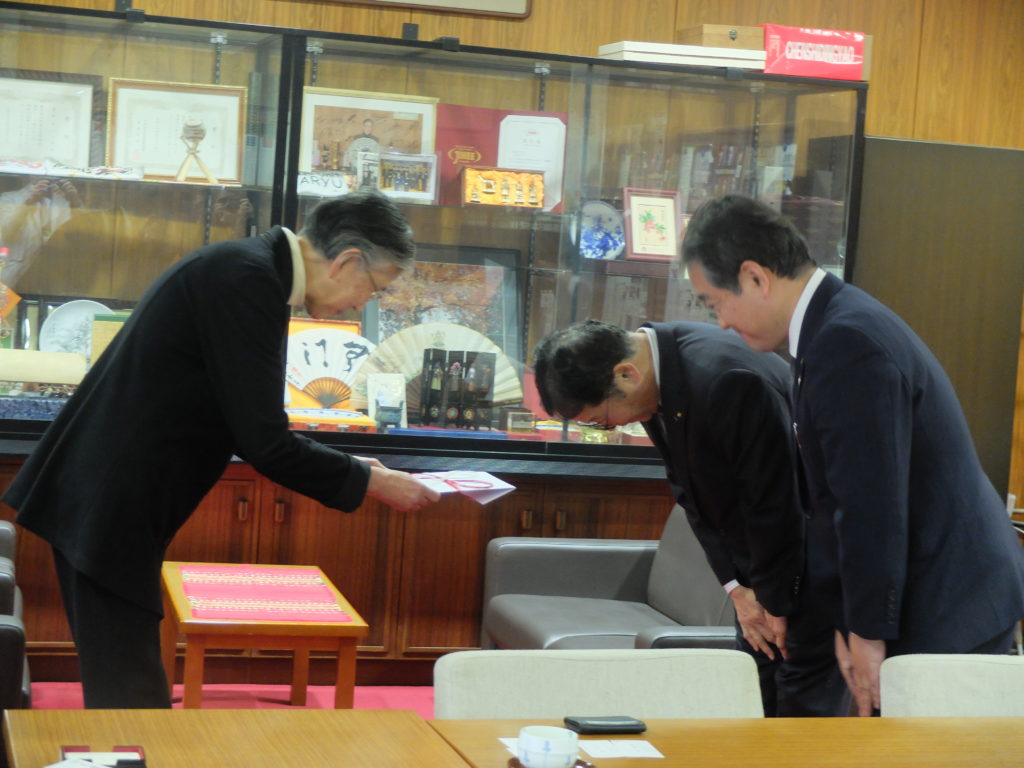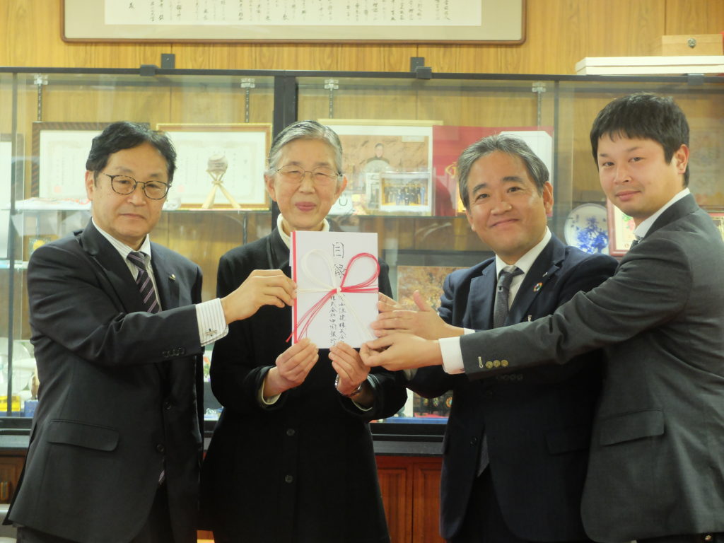 12月16日(月)に学長室にて贈呈式が行われ、関西住建株式会社の原隆之社長並びに中国銀行株式会社の田中智三原支店長から、松田学長に目録が手渡されました。