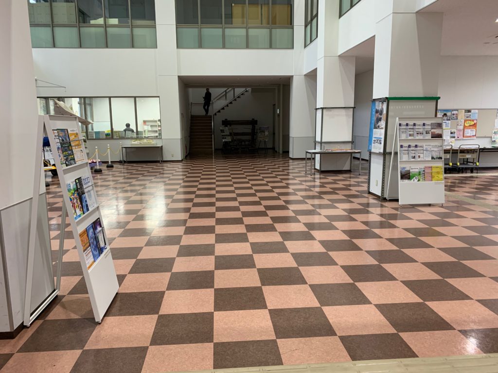 贈呈していただいたパンフレットラックは、工学部棟の玄関ホールを往来する人の動線を念頭に、1竿はエレベーター正面から出て左側の柱の横に、もう1竿はエレベーター入口の右に設置しました。白いラックは、工学部棟の壁に良くマッチしますね。