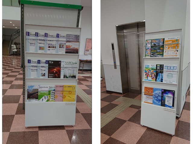 これで、工学部棟の玄関ホールの机上に平積みにしていた学生向けのセミナー等のリーフレットや学生の皆さんに是非読んで貰いたい雑誌(松田学長から学部にいただいている冊子などもあります)などを機能的に陳列できるようになりました。