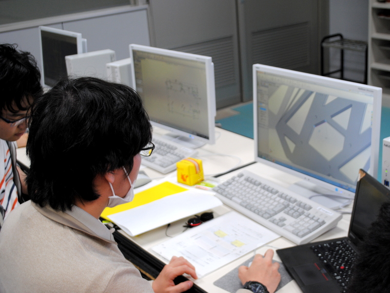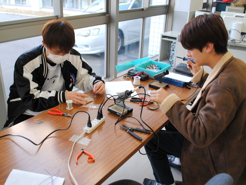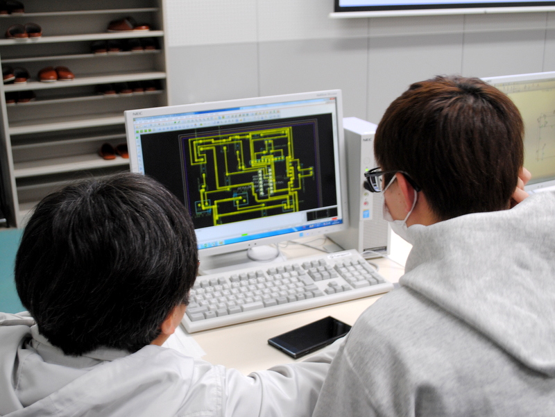 コンピュータで設計したものも、最後は地道なハンダ付け作業や工具を使ったネジ穴加工を行います。きちんと作業服を着て工具や作業場の使い方のマナーを学ぶことも優秀なエンジニアには必須なのです。ものづくりの環境が激変する現代において、様々な知識を身につけ、強いエンジニアに育っていってもらうことが狙いです。