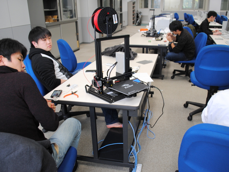 3年生後期の「MBD実習Ⅱ」。MBDとは、モデルベースデザイン(Model Based Design)のことで、コンピュータ上でのシミュレーションや開発アプリケーションを駆使し、性能検証、使いごこちの評価などを製作前に吟味して開発を行っていく方法論です。大学という教育機関において、実際のものづくりを体験しそこからのフィードバックで学ぶことは大変難しいですが、MBD ではスマートに頭を使います。この授業では、数人のグループに分かれて各人が興味を持ったデバイスやモノの製作を目指し、それを実現するためにコンピュータやソフトウェアを活用するという授業を展開しています。今回のテーマは、3Dプリンタを活用した小型ロボット開発、ゲームコントローラの開発、画像認識する人工知能開発などです。「ものづくり加工実習」も「MBD実習Ⅱ」も、年度末にどのような成果物ができあがるのか・・・?楽しみにしていてください!