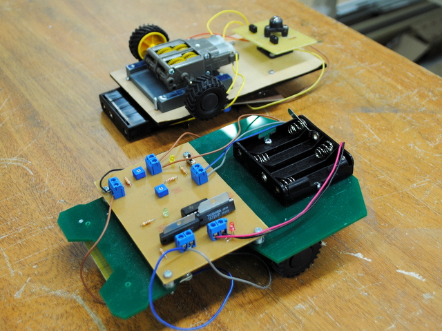 昨年度の学生製作のライントレースカーです。タイヤ、車体、電子回路を製作します。