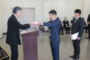 松田学長から、「今後は地域のため、大学のため、そして自己の成長発展のために各分野で活躍し、学生の模範となるように頑張ってください。」と激励のお言葉をいただきました。そして、学生を代表して学友会サッカー部の山本くんが、「これからも一生懸命精進してまいります。」と御礼の挨拶を述べました。さらに、式典後は恒例の記念撮影を行いました。