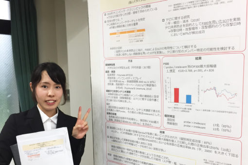 岡﨑さんは、昨年行われた中国四国心理学会第75回大会にて「SCITを用いた模擬テロ実行犯メンバーの検出―P300を指標として―」について発表し、見事大会優秀発表賞を受賞しました。その功績が認められ、この度学業部門(個人)の学長賞を受賞しました。