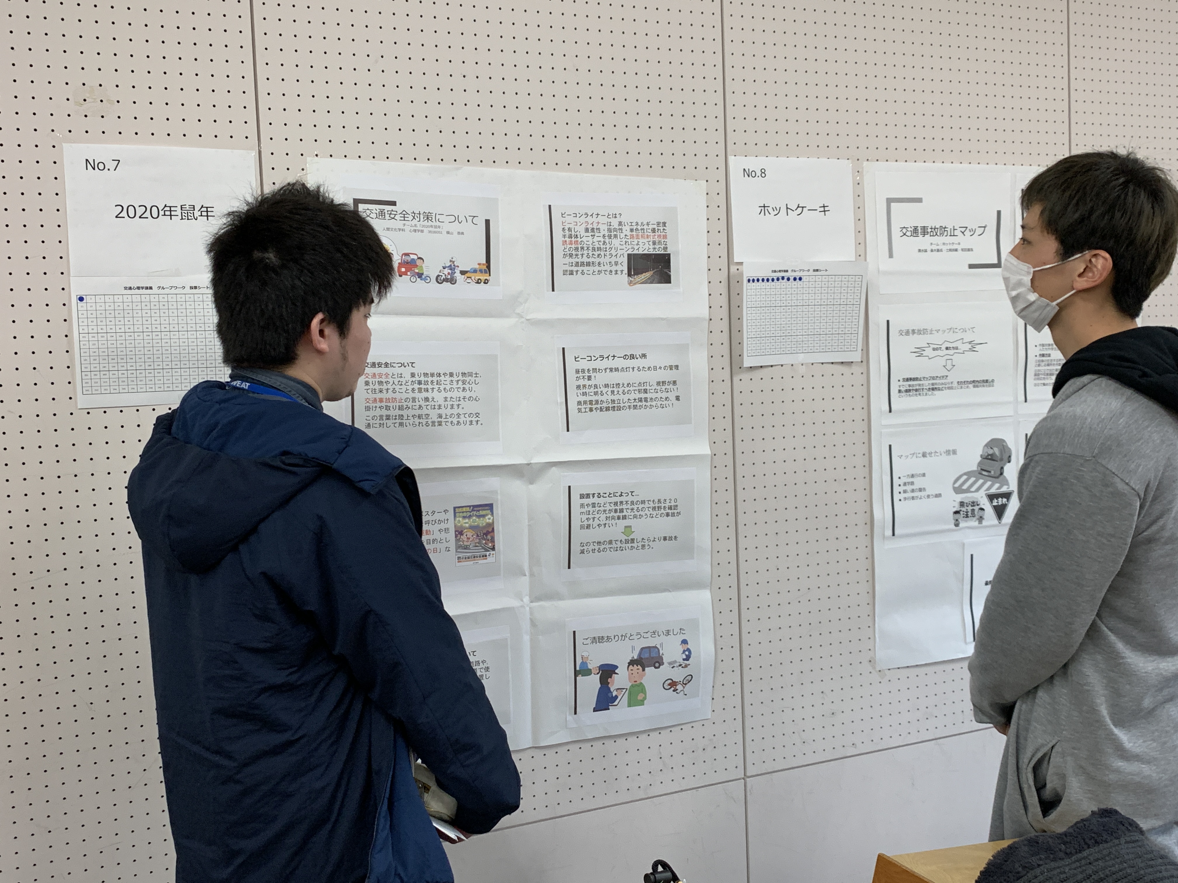そのワークの集大成が、本講義最後に行われる交通安全対策・交通事故防止策についてのアイディア発表会です。本年度は22グループに分かれ、「新しく、有効な、斬新な、交通安全対策・交通事故防止策を考えよう!」というテーマで、ポスター形式で発表してもらいました。