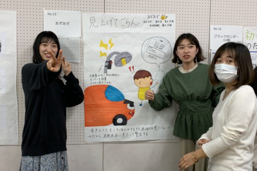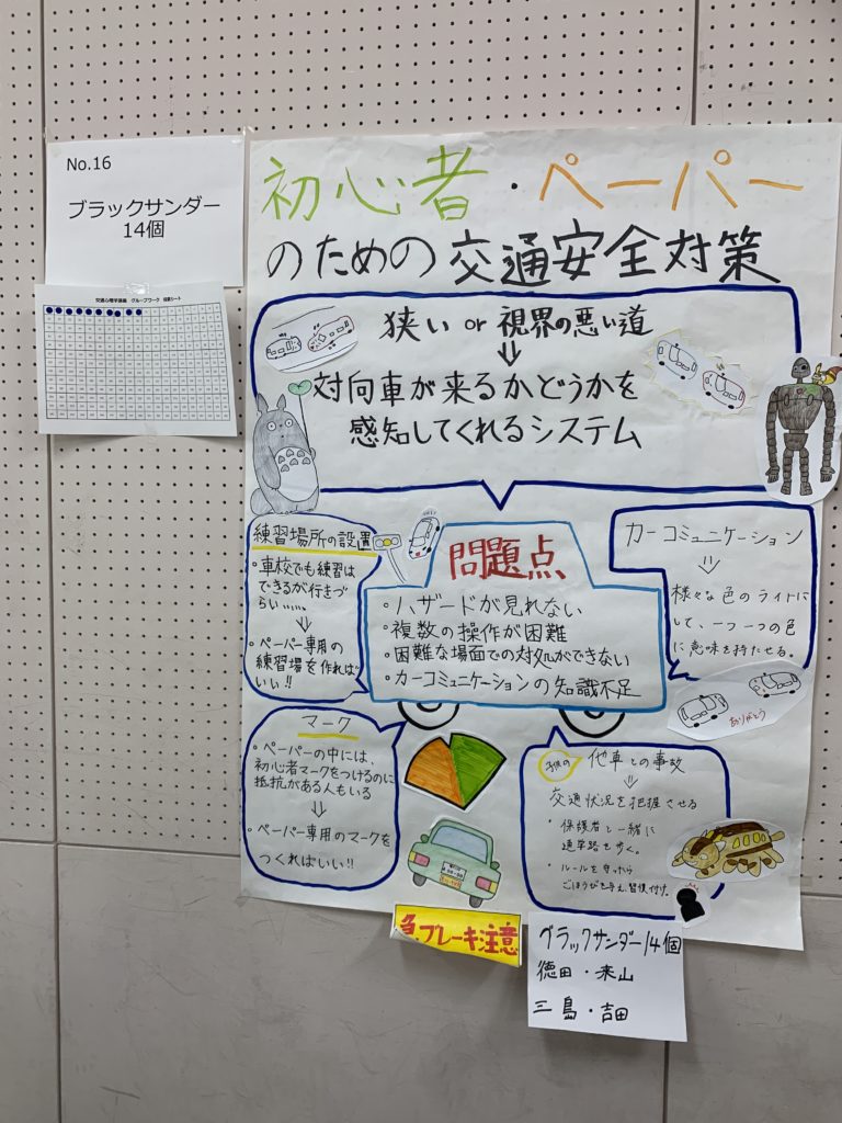 また、大学生ならではの初心者やペーパードライバー向けの様々な対策を考え、ペーパードライバーマークの提案をしてくれたグループもありました。他にも、アプリの開発やあおり運転防止策、狭路における事故防止策等々、たくさんの発表がありました。ここで全部ご紹介できないのが残念なくらいです。