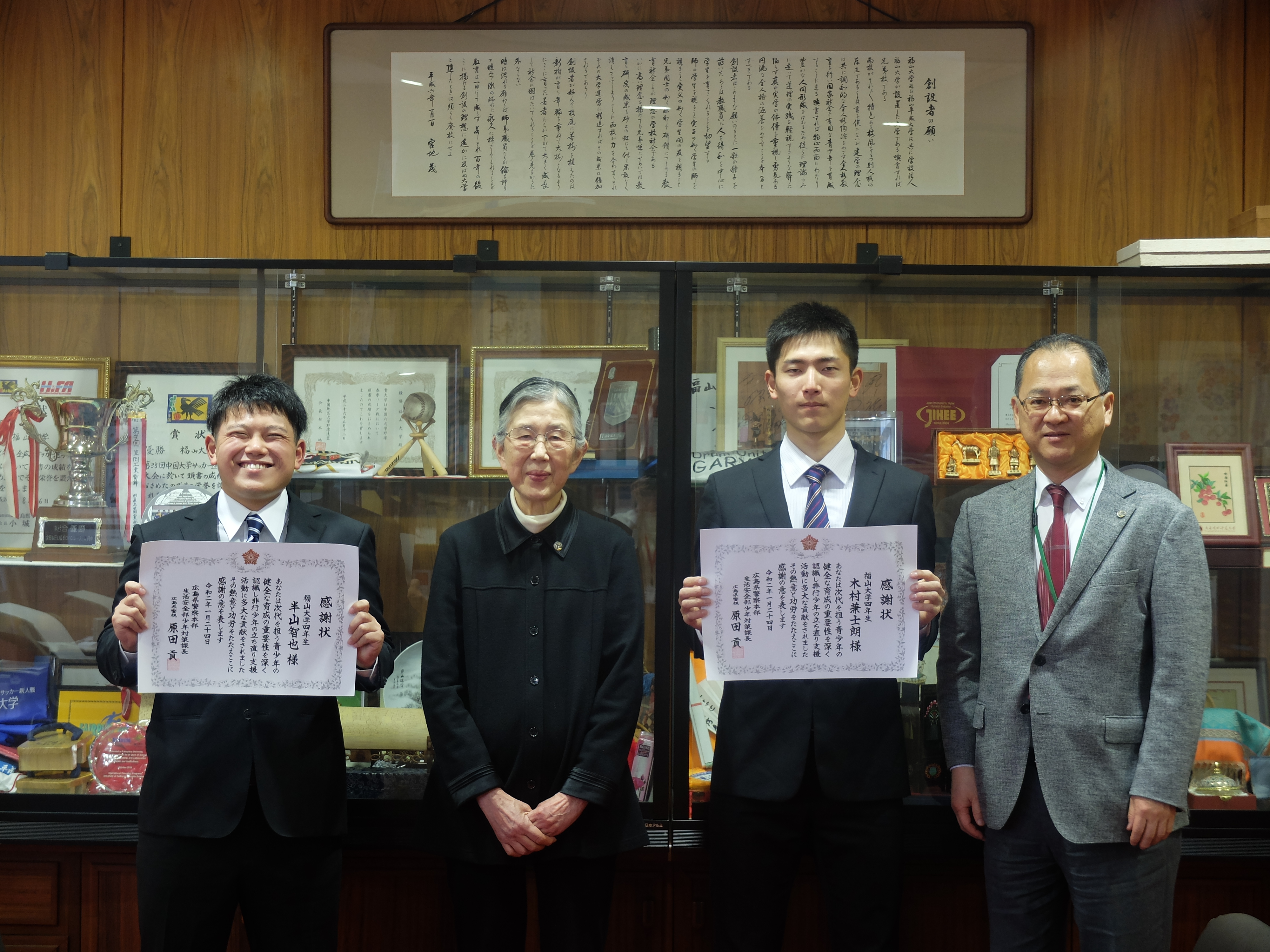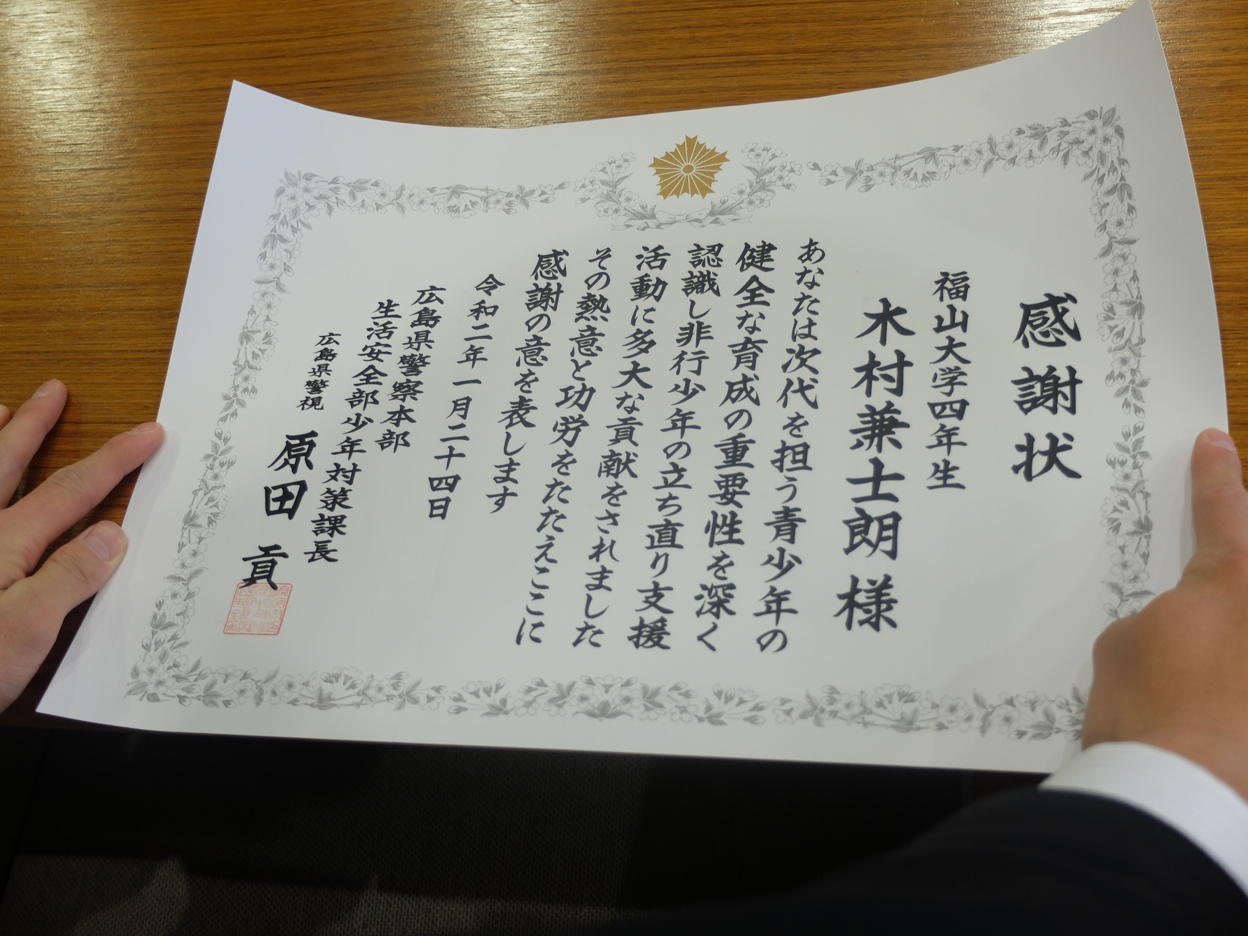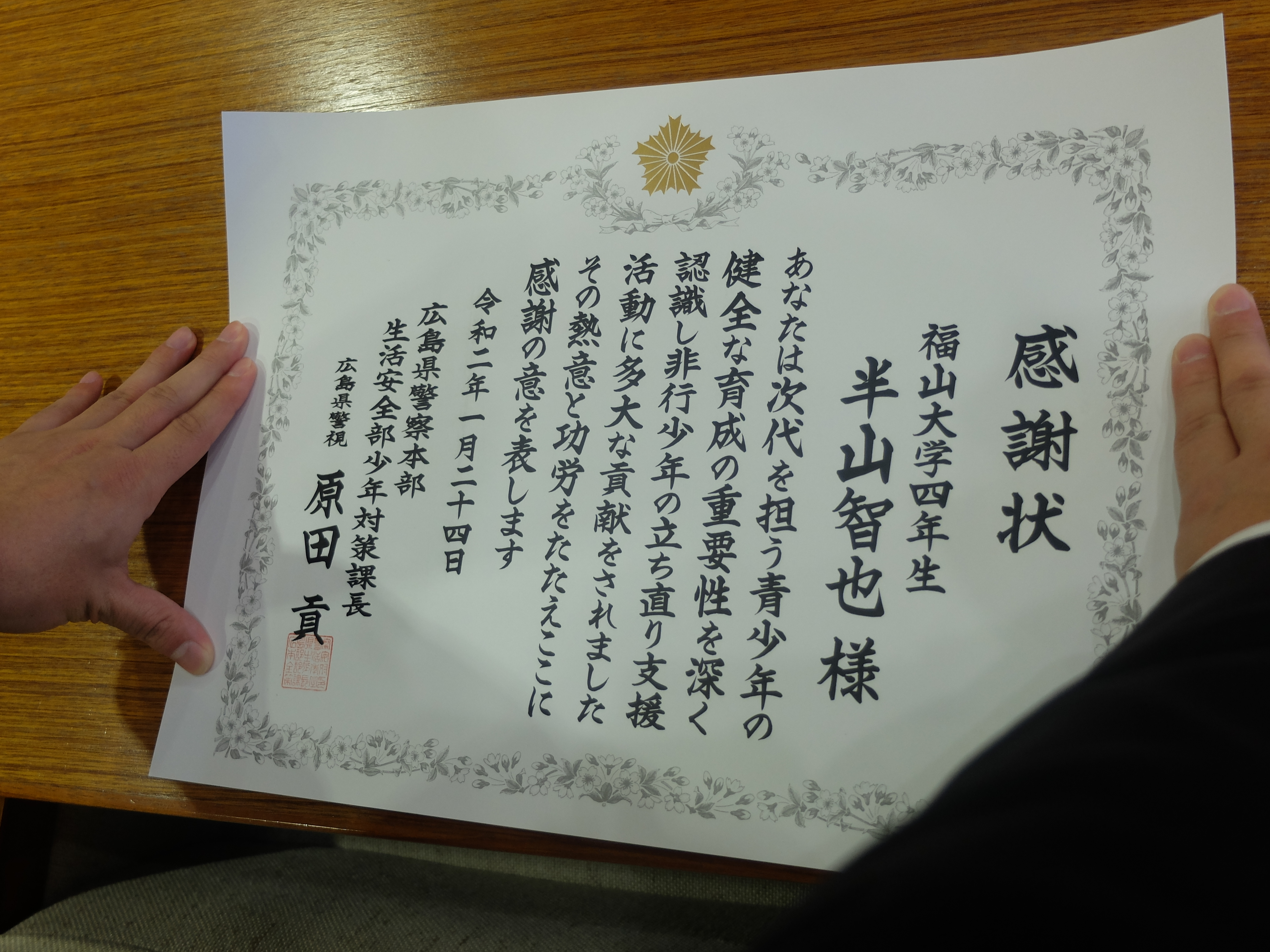 犯罪心理学研究室のゼミ生である木村兼士朗君と半山智也君が、揃って広島県警察本部生活安全部少年対策課長から感謝状をいただくという栄誉に浴しました。当日は半山君に先約があったため、木村君が代表して受け取りました。