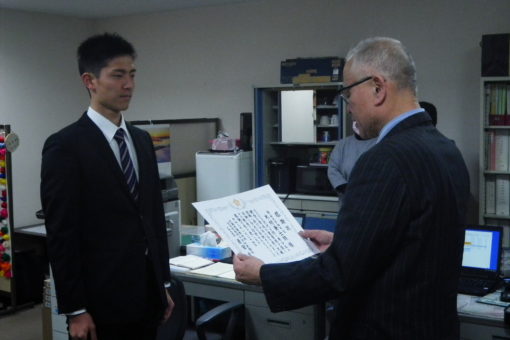 1月29日(水)に受賞に至った経緯などを説明するため、学長室訪問を行いましたので、その際の様子を指導教授の平伸二教授に紹介いただきます。