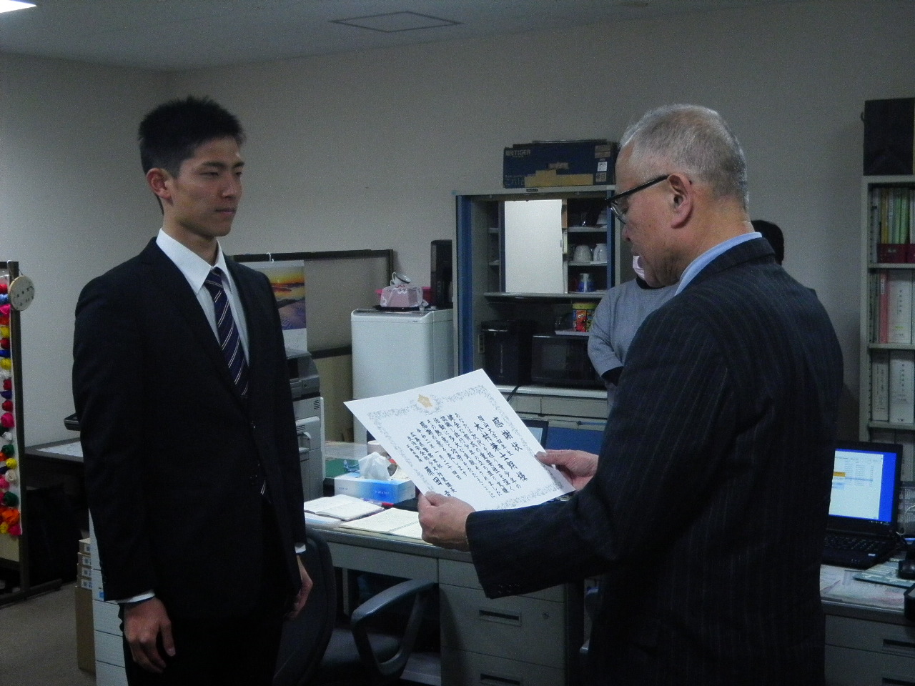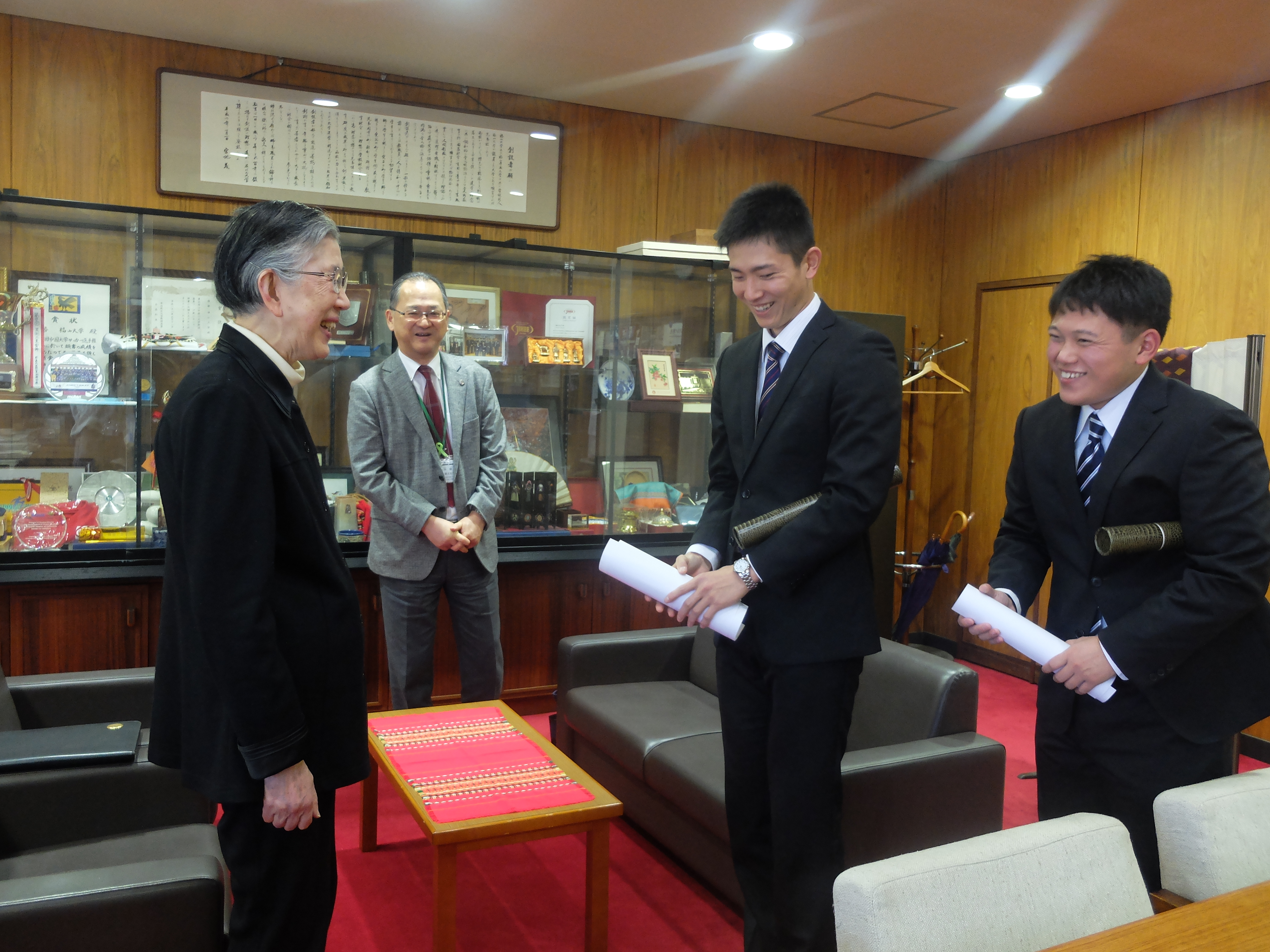<松田学長へ報告する木村君と半山君>