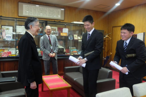 高校まで硬式野球部の捕手として活躍した木村君、本学陸上部主将としても頑張った半山君という体育会系の2人ですが、心はとても穏やかで優しく、学長との面談でも礼儀正しさの中にも人柄の良さがにじみ出ていて、今後の彼らの成長がますます楽しみになってきました。