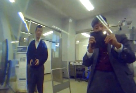 動画はこちらです。このときのドローンから見た様子は下の写真のようになります。設計製作者の沖准教授、撮影者の仲嶋学科長がばっちり写っています。
