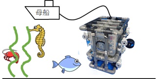 動画はこちらで見ることができます。浸水もなく、基本動作もOKでした。次は海中テストです!以下、もう少し詳しくこの水中ドローンについて説明しますね。水中ドローンとはROV(Remotely operated vehicle)とも呼ばれる遠隔操作型の無人潜水機です。この海中ドローンは、藻場で生育する稚魚やプランクトンなどの生態を観察できることを目指しています。イメージはこんな感じですね。