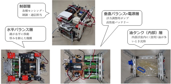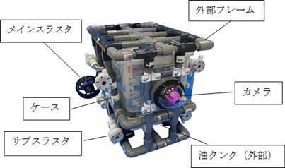 前後左右の移動はメインスラスタ(スクリュー)で行います。上下の移動は、サブスラスタと油タンクで行います。油タンクは、魚でいう浮袋の働きをします。油をケース内に移動させるとドローンは沈み、外部に移動させると浮き上がります。カメラは観察用ですね。上下にカメラを向けることもできます。電子回路はケース内に収まっていて、これを囲む外部フレームにカメラやスクリューなどを取り付けています。