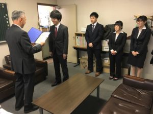 鶴田学部長より各学生に一人ずつ賞状が手渡され、激励の言葉が贈られました。