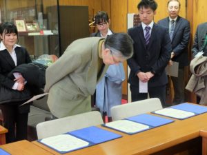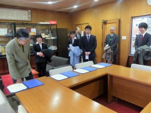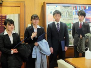 左から鶴田学部長、田中さん、番匠谷さん、松田学長、小峠さん、角南さん、田村学部長補佐です。