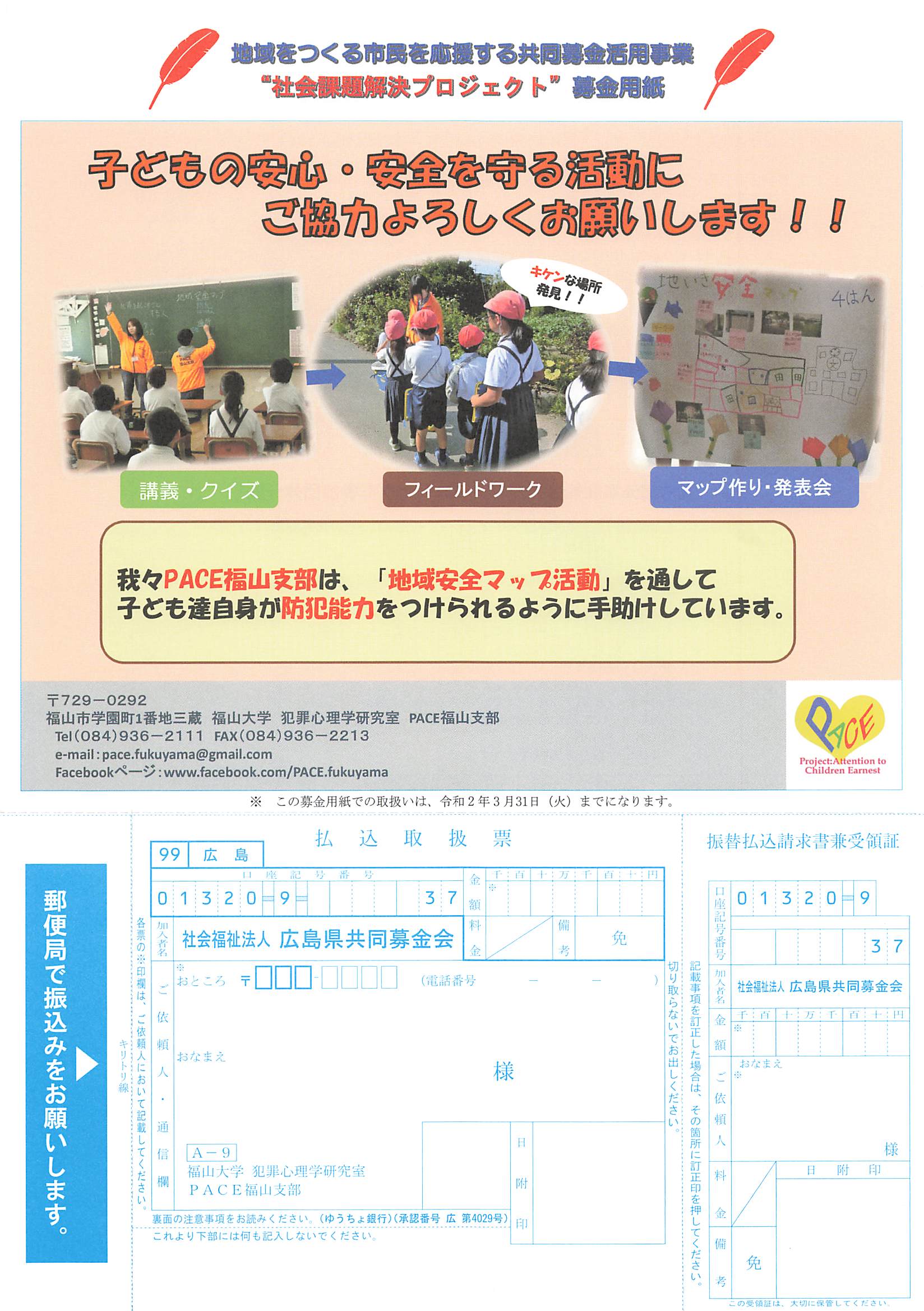 松田学長には、プロジェクトリーダーの廿枝さんが用意した募金用紙(写真1)とPACE福山支部のパンフレット(写真2)を提示しながら説明しました。