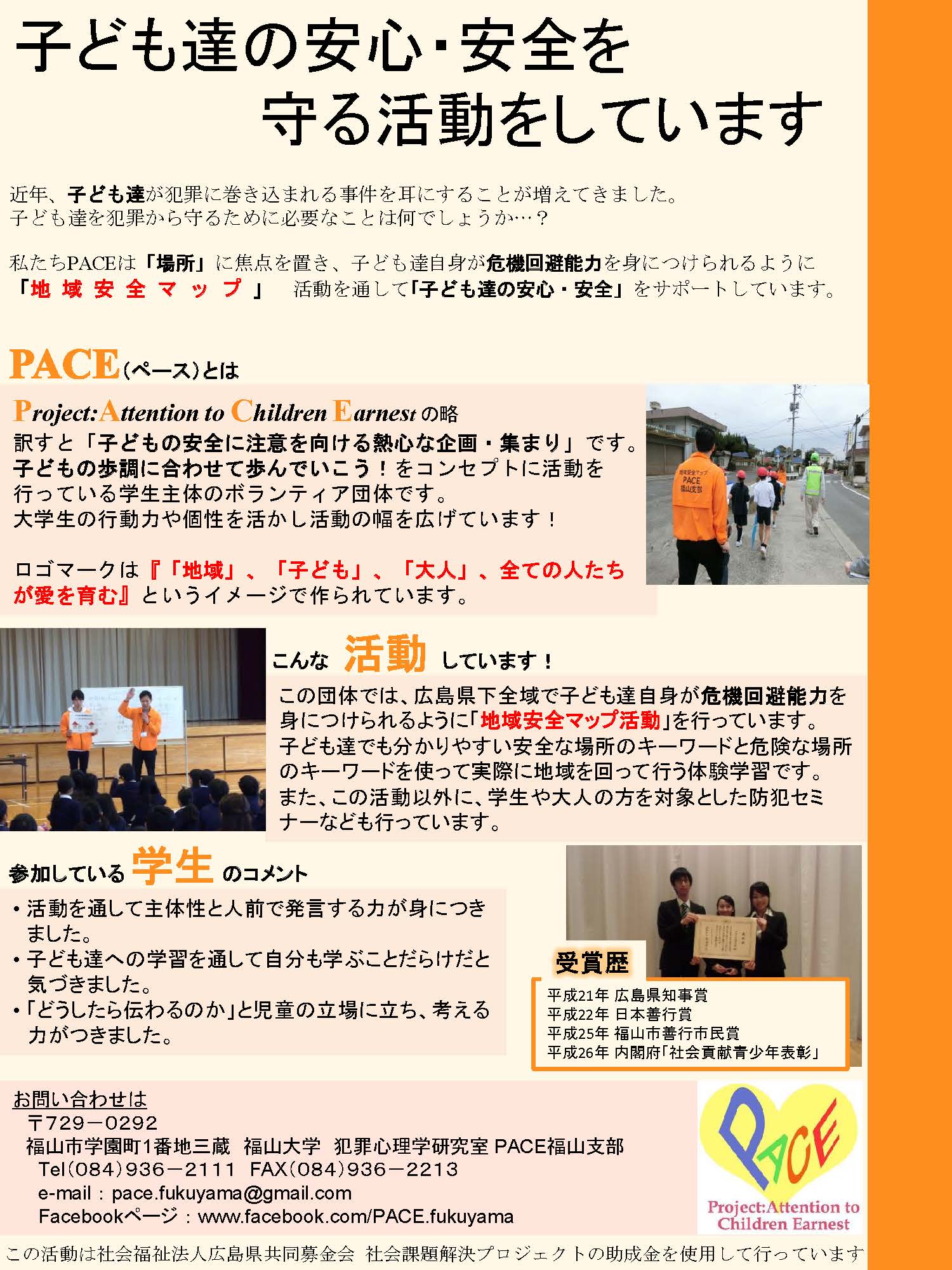 PACE福山支部の主な活動は、子ども自身が危険な場所を予測し、犯罪被害を回避する能力を身につけることができるようにすることです。2005年から活動は継続しており、平成26年度には内閣府特命大臣表彰も受けています(詳しくはこちらの内閣府のページをご覧ください)。