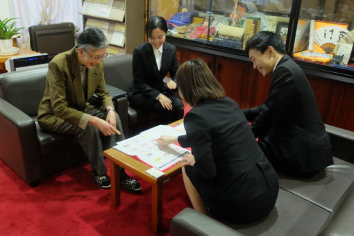 実は、社会課題解決プロジェクトに選ばれるのは9年連続であり、松田学長はすでによくご存じの内容ですが、知らぬ顔で最初から丁寧に説明を聞いてくださり、お願いに行った3名にとっては緊張の中での良い学びにもなったと思います。また、説明資料も持って記念撮影もしていただきました。
