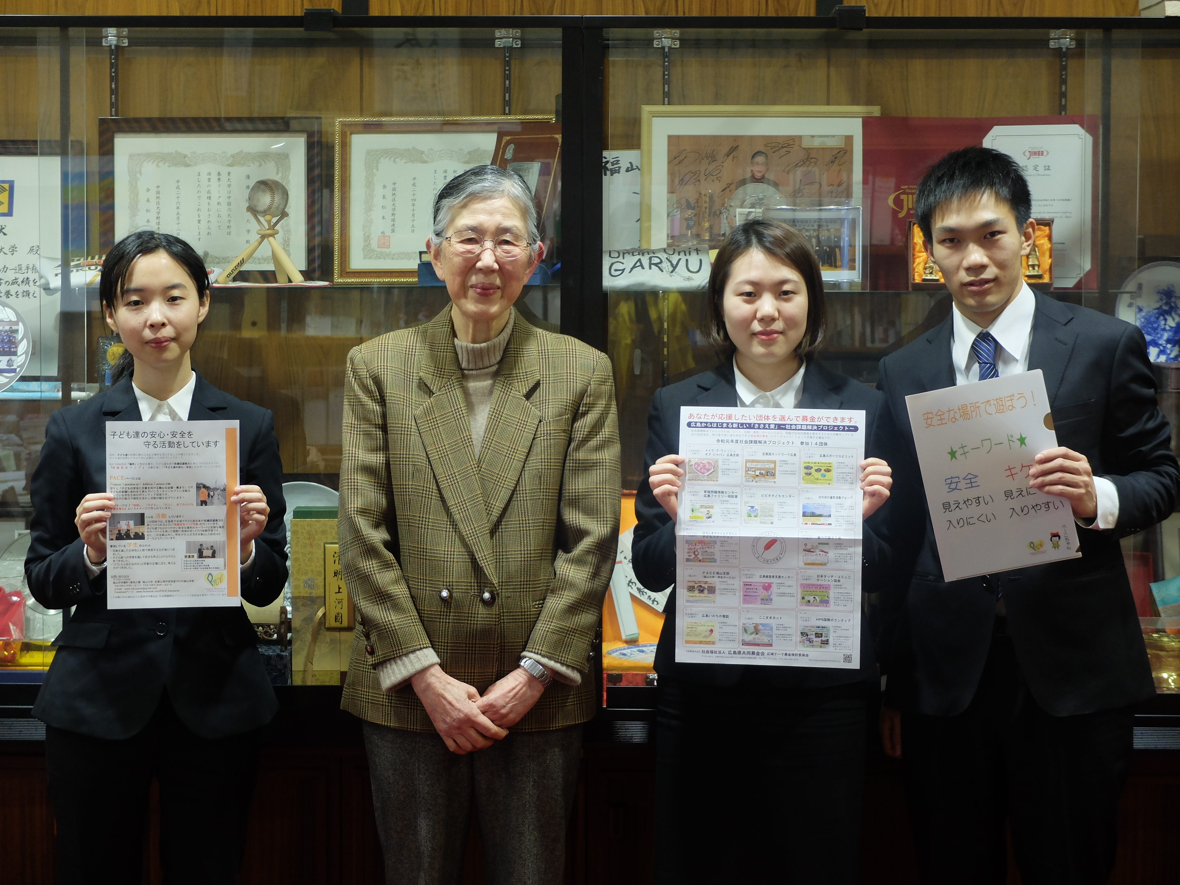 自ら活動資金を得ながら子どもたちのために活動する姿はとても頼もしいですね。福山大学心理学科は、「犯罪心理学研究室」と「捜査心理学研究室」の2つの研究室を持つ西日本屈指の犯罪心理学の拠点です。これからも安心安全な社会を目指し、張り切って活動していきます!