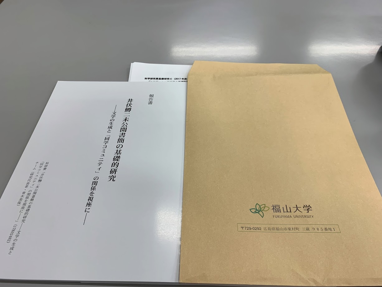 「井伏鱒二未公開書簡」は、福山中学時代の井伏の同級生・高田類三に宛てた160通あまりの書簡で、これによって、それまで知られることのなかった井伏の中学卒業前後から文学習作期を含む文学形成期の井伏の動向を知る端緒が開かれることとなりました。この資料の存在については、2016年10月にプレスリリースし、新聞各紙で大きく取り上げられました。同年、科学研究費に応募し、2017年4月1日付で、基盤研究C17K02482「「井伏鱒未公開書簡の基礎的研究―文学の生成と「同学コミュニティ」の関係を視座に」(2017年度~2019年度)として採択されたところです。