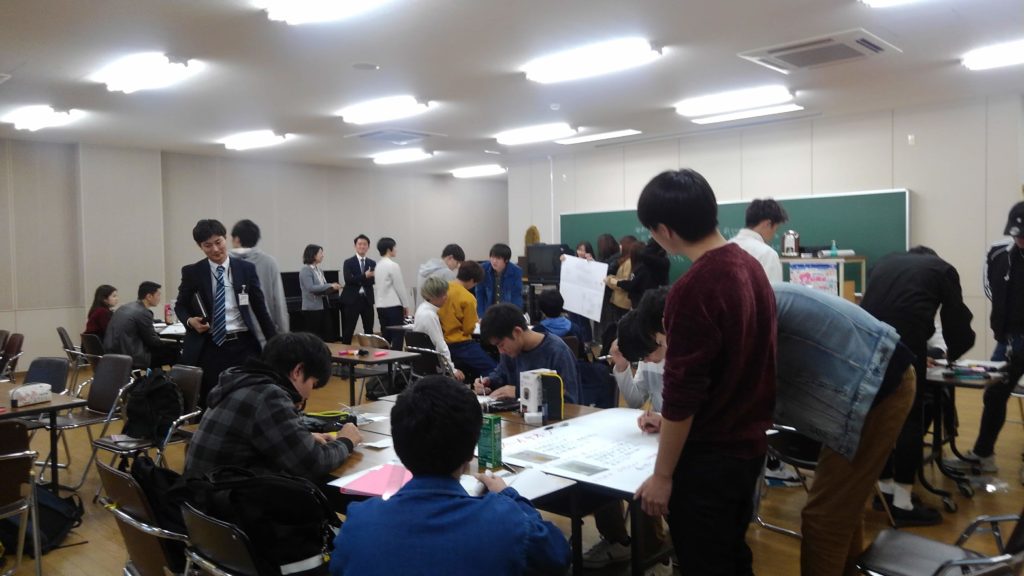 前期授業で連携したエブリィホーミイホールディングスは、コラボ授業に全面協力の強い姿勢を打ち出してくださり、総勢2名のベテラン社員を派遣してくださいました。また、26名の受講生を6つのグループに分けて、グループごとに新ビジネスの提案に向けた調査に取り組みました。課題として、エブリィホーミイホールディングスが、世羅の自社農場「エブリィふぁーむ」において独自に取り組んでいる、いわゆる化学肥料や農薬に依存しない草や木に含まれる「炭」素を微生物の力で土へ「循」環させる「たんじゅん農法」により栽培している様々な野菜(主に人参)の販売方法を提案して、最終的に本社でプレゼンテーションを行いました。