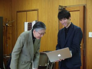 黒木くんは、松田学長を前に人工知能を使った給餌システムについて簡単に説明しました。松田学長も強化学習をご存じだったので、強化学習の話で盛り上がりました。また、学会の様子について、写真を通して伝えました。