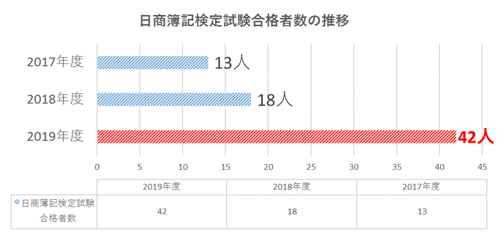このグラフからも明らかなように、今年度の日商簿記検定合格者数は「42人」となり、合格者数は対前年度比で「233.3%」と2倍を超える結果となり、大幅な合格者増を達成しました。