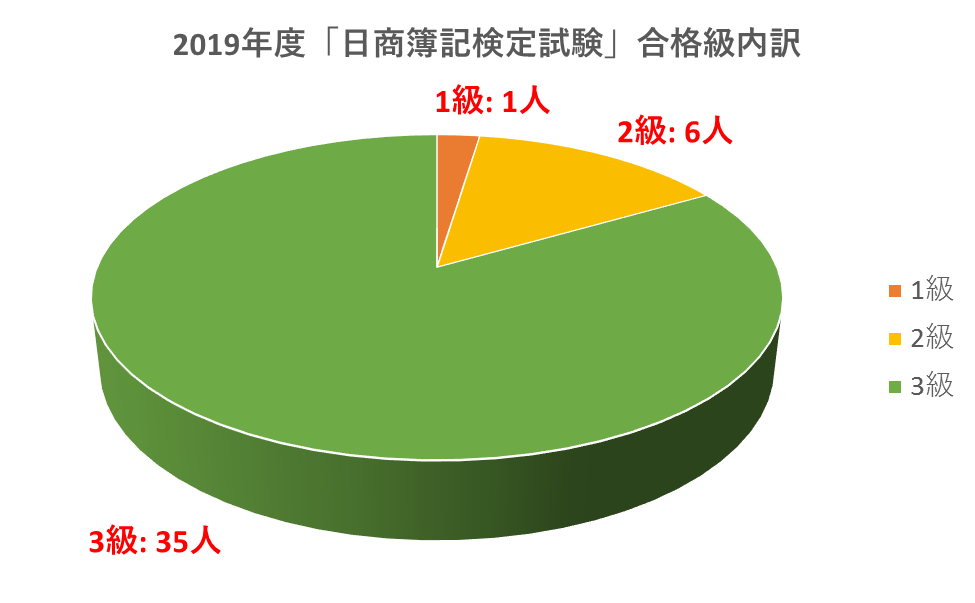 今年度の日商簿記検定試験合格級の内訳は、1級が「1人」、2級が「6人」、3級が「35人」でした。前年度(2018年度)の日商簿記検定合格級の内訳が、1級「0人」、2級が「4人」、3級が「14人」であったことと比較すると、全ての級において1.5倍から2倍近くの合格者数の増加となっており、大きな成果を上げられたといえます。