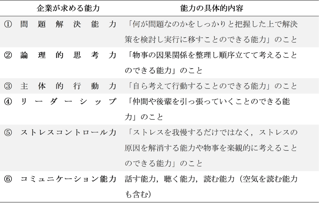 教育体験をすることで、自らの資質を伸ばし、客観性や判断力を養成することは就職活動にとっても有利になることは間違いありません。企業はたとえば以下のような能力を求めています。